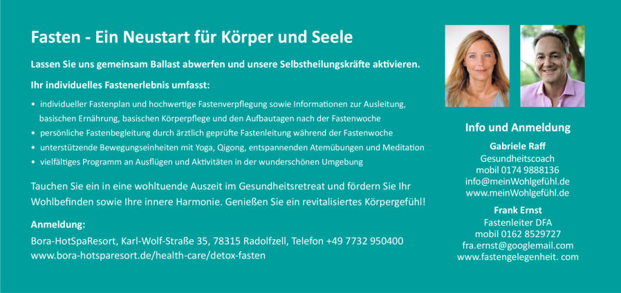 Geleitet von Gabriele Raff, Gesundheitscoach, selbstständige Fastenleiterin, psychologische Beraterin und Yogalehrerin (Yin Yoga) und Frank Ernst, Fastenleiter der Deutschen Fastenakademie, Yogakursleiter, Nordic-Walking-Trainer, Jin-Shin-Jyutsu-Praktiker, Ayurveda Koch und Masseur.
